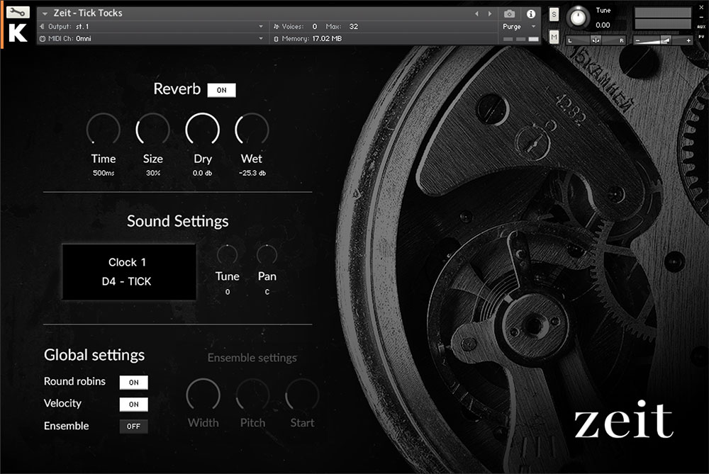 Zeit is a collection of ticking sounds for Kontakt 7+ (full version). It includes recordings from old mechanical clocks, stopwatches, kitchen timers, and plenty of other sources.